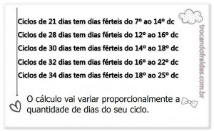 Les femmes qui ont des jours de cycle variables, un cycle de 30 et un cycle de 32 devraient ajouter cette variation de jours plus et moins au tableau. Ainsi, une femme qui ovulerait le 16ème jour du cycle, devrait considérer le début de sa période fertile du 11ème au 21ème jour du cycle.