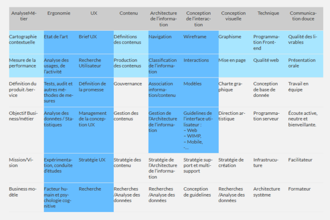 Raphaël Yharrassarry élabore un tableau des compétences T possibles en design UX. Source : iergo