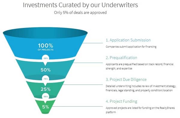 Processus d’investissement de financement participatif immobilier Ce niveau d’analyse signifie que seulement 5% des transactions immobilières soumises à Streitwise ne sont jamais financées. Une fois qu’une propriété passe par l’entonnoir, elle est inscrite sur le portail où les investisseurs peuvent faire leur propre analyse et décider s’ils veulent investir.