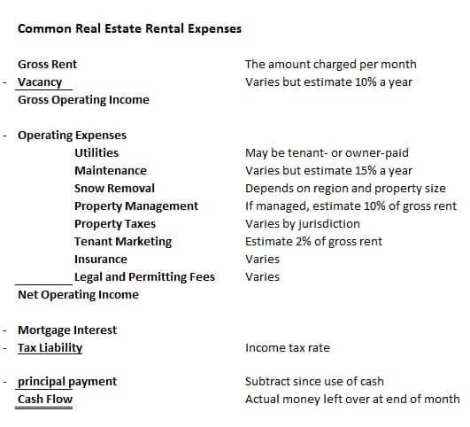 Estimer les dépenses est où un réel groupe d’investissement immobilier est utile. Il est assez facile de budgétiser l’hypothèque mensuelle, mais les dépenses peuvent vous attraper rapidement. Budget pour au moins 10% de poste vacant et jusqu’à 20% du loyer brut consacré aux dépenses. C’est toujours une bonne idée de mettre de côté un fonds de trésorerie pour couvrir les dépenses imprévues.