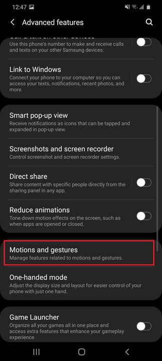 - Ouvrez Paramètres > Fonctions avancées> Mouvement et gestes .