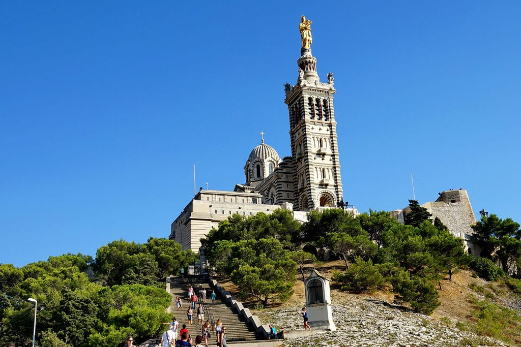 C’est une église néo-byzantine du XIXe siècle à 150 mètres au-dessus de l’eau, avec une grande statue dorée de la Vierge à l’Enfant au sommet de sa tour pour surveiller les communautés maritimes de Marseille.