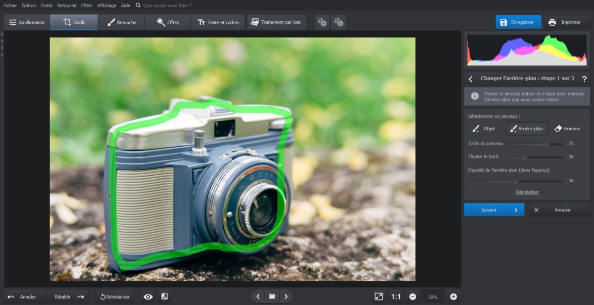 Après avoir téléchargé et installé PhotoWorks sur votre ordinateur, démarrez-le et ouvrez votre photo. Cliquez sur l’onglet Outils et sélectionnez l’option Changer l’arrière-plan.