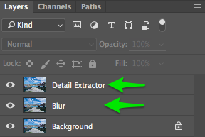 Chiama il primo livello Sfocatura e il più alto dei due duplicati si dovrebbe rinominare in Estrattore dettagli. Nascondete il livello Estrattore di dettagli facendo clic sull’icona a forma di occhio per questo livello nel pannello Livelli.