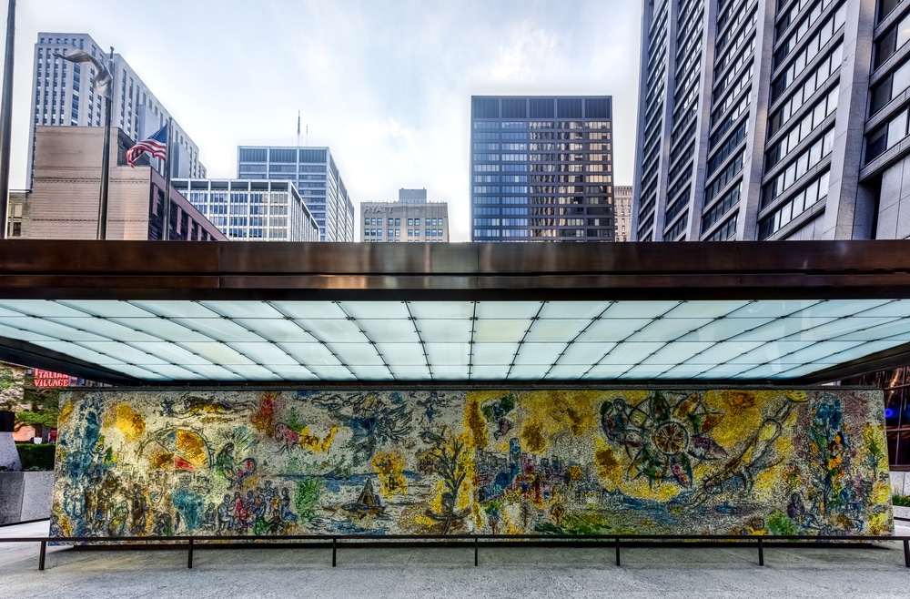 Mentre parliamo di Chagall — quando l’artista venne a installare il mosaico negli anni ’70 ha prodotto una serie di vetrate colorate per l’Art Institute di Chicago per celebrare il Bicentenario americano.