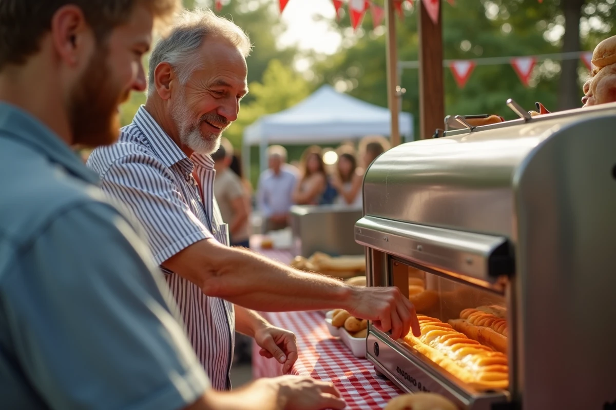 Pour un événement en intérieur avec prise électrique accessible, la machine vapeur avec thermostat réglable est plus adaptée : elle maintient une température constante, les saucisses ne sèchent pas, et les pains restent moelleux même après deux heures de service. Pour un événement en extérieur ou un format plus spectaculaire, le roller grill a l’avantage visuel – les saucisses qui tournent, ça attire l’œil.