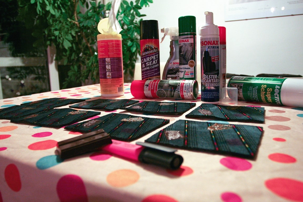 Afin de rendre le travail plus difficile, nous avons testé chacun trois types de taches. La première tache que tous les hommes d’affaires ont rencontrés, mais aussi les parents, est une tache d’un marqueur. Combien de fois avez-vous laissé sur le banquette arrière un marqueur qui débranchait et relâché l’encre ou les enfants ont-ils décidé de vous remettre une carte de Noël à l’arrière du siège passager ? Les taches de marqueur sont communes dans la voiture, tout comme les taches grasses. Nous avons donc fait un mélange de ketchup et d’huile, qui servira d’exemple numéro deux. Toutes ces sauces de plats à emporter, sandwichs et autres s’enfuient souvent et finissent sur vos sièges, tapis… La troisième tache se réfère également à la nourriture, et c’est le favori — le chocolat. Il suffit qu’un morceau de chocolat tombe de façon transparente sur votre siège et votre sol et se dissout là et bientôt. Croyez-moi, c’est une tache avecce qui n’est pas facile à faire face.