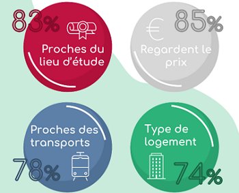 Per l’85% degli studenti, il primo elemento analizzato durante la ricerca è l’importo dell’affitto. Infatti, la quota di affitto delle spese può essere sostanziale e avere un impatto sulla vita studentesca. Per il 74% degli studenti, il tipo di proprietà che stanno cercando è ampiamente considerato.