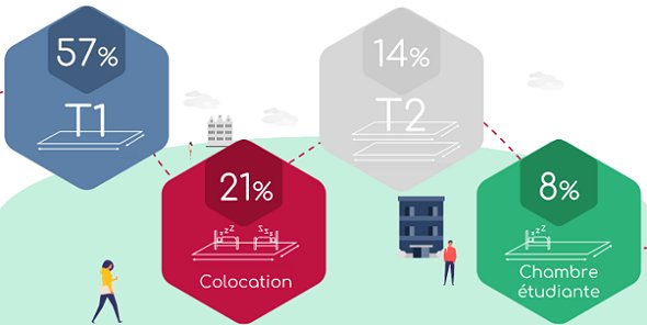 Molto apprezzato per i suoi vantaggi economici e cordialità, la colocation è la seconda modalità di alloggio più popolare con 21%. Troviamo poi gli appartamenti T2 con una camera da letto separata. Richiedono un investimenti più costosi, è per questo che solo il 14% indirizza la loro ricerca a questo tipo di proprietà.